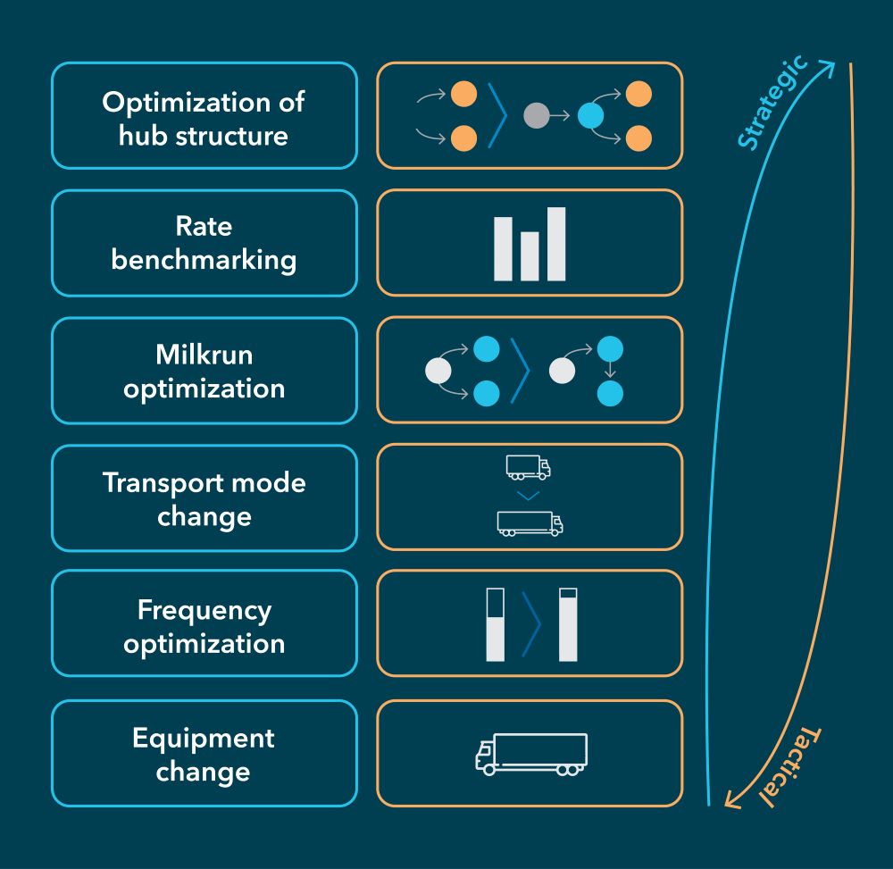With a combined strategic and tactical approach to optimization with repeatable processes, businesses can quickly and proactively plan changes to their networks. Whether it’s optimizing hub structures or milk runs, benchmarking rates or changing modes of transportation, different strategic or tactical levers can be identified and used to effectively optimize the network.
