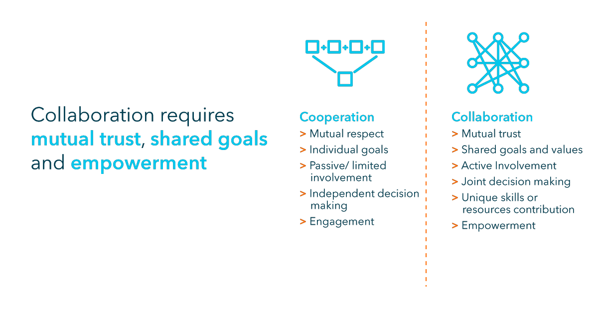 Of course, working together requires mutual trust – and aligning on common goals and empowering individual stakeholders are keys to success. There are different models of working together, from cooperation to collaboration to coopetition, or collaboration between competitors.