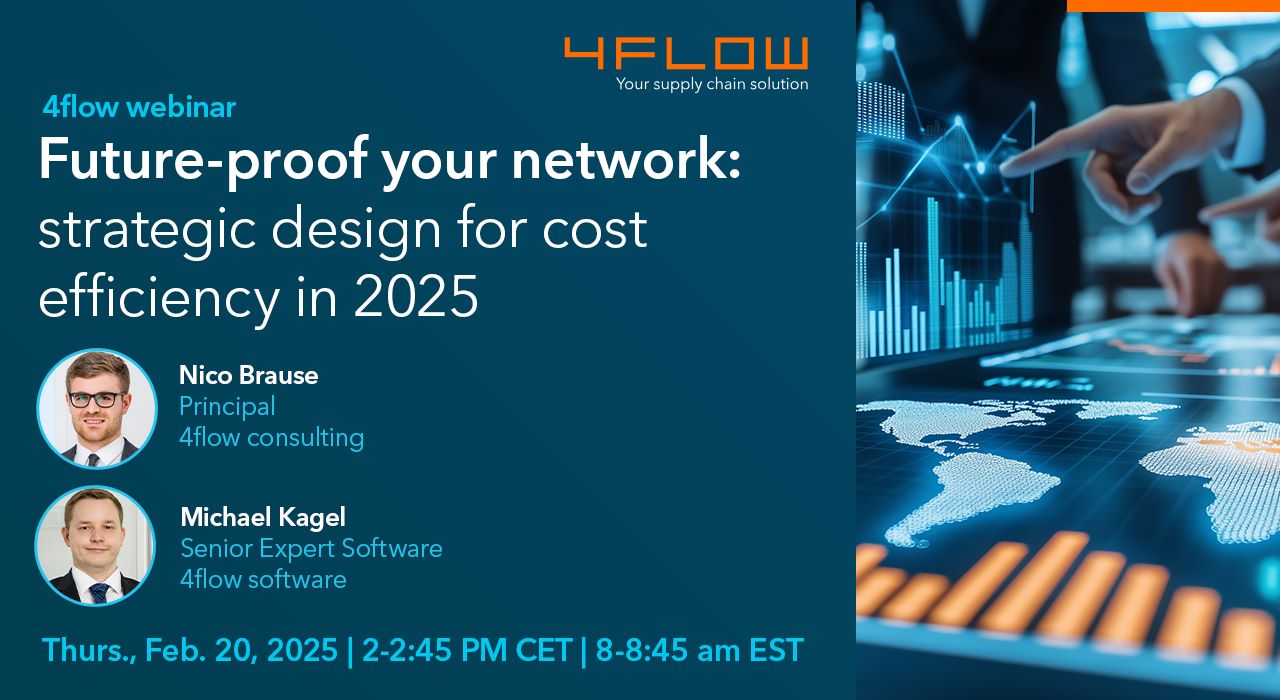 Join us to explore advanced strategies like scenario modeling, risk assessment and cost-service trade-offs with 4flow VIA®. You’ll discover actionable insights and get a clear roadmap to optimize your network for evolving market demands.