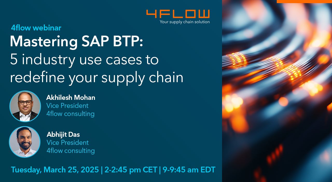 Join us to discover the tools and capabilities in SAP BTP to drive supply chain innovation and efficiency in your supply chain. Whether you’re looking to enhance visibility, optimize your logistics processes or develop custom solutions for specific challenges, you’ll find actionable use cases for your organization.